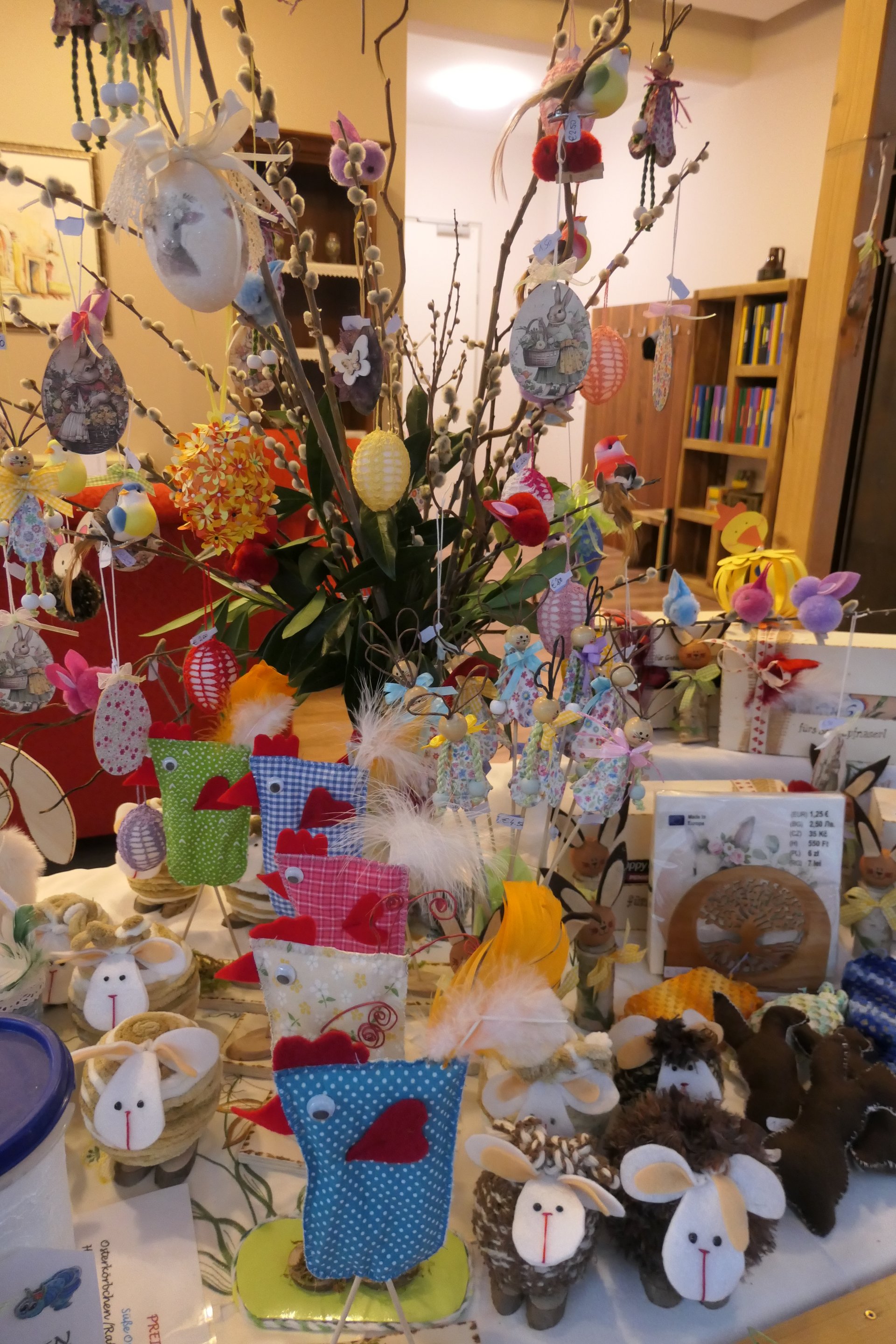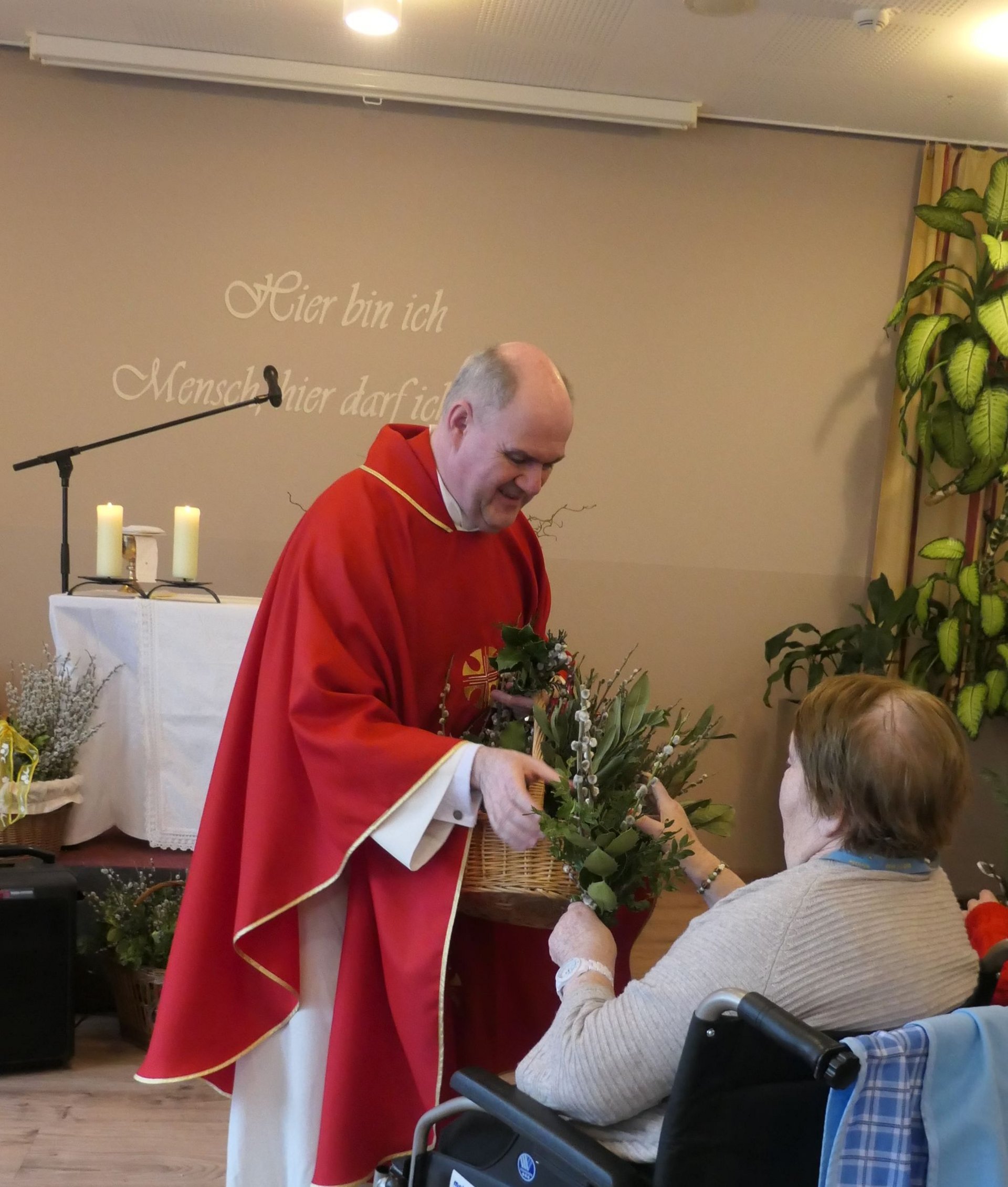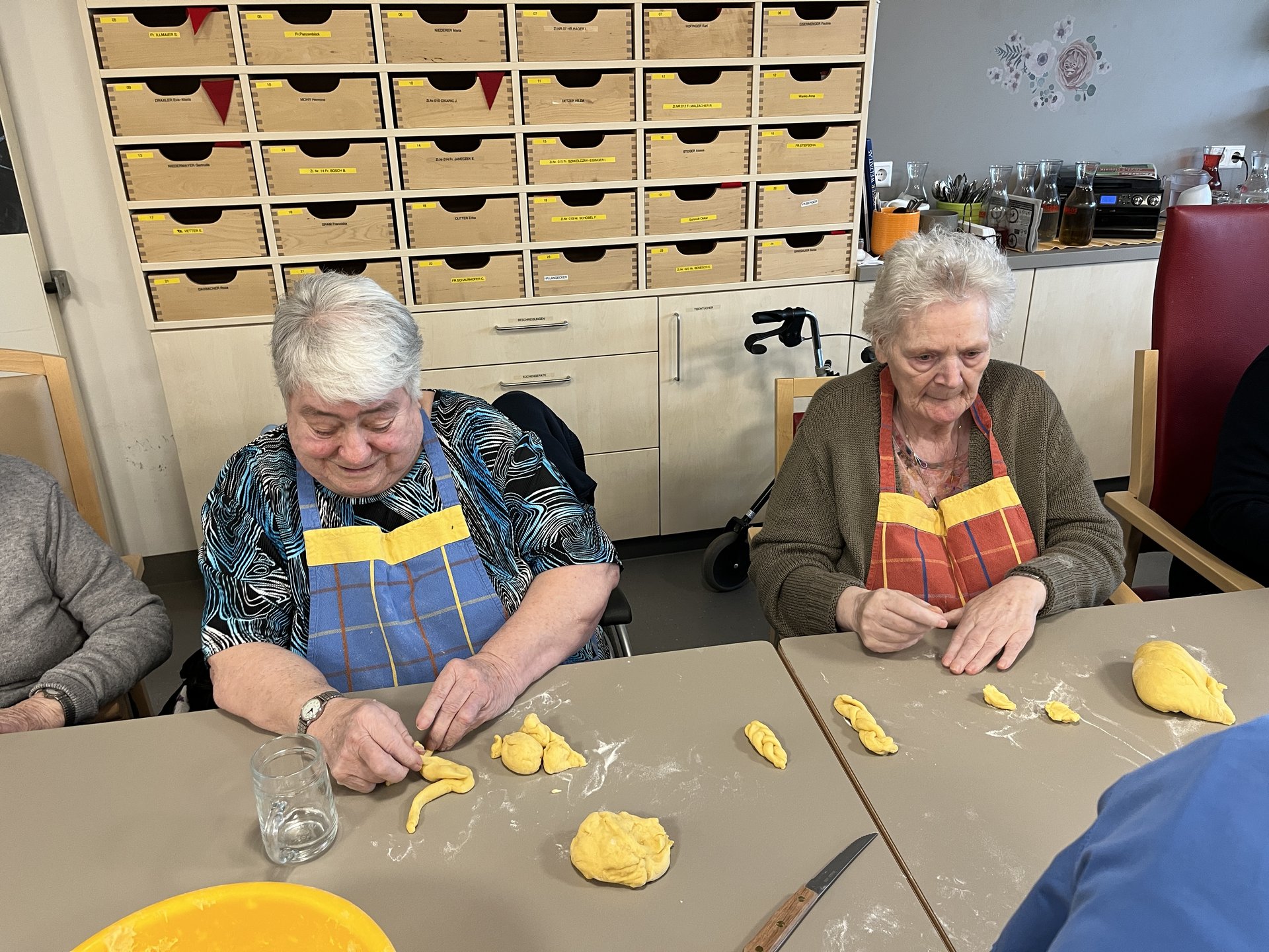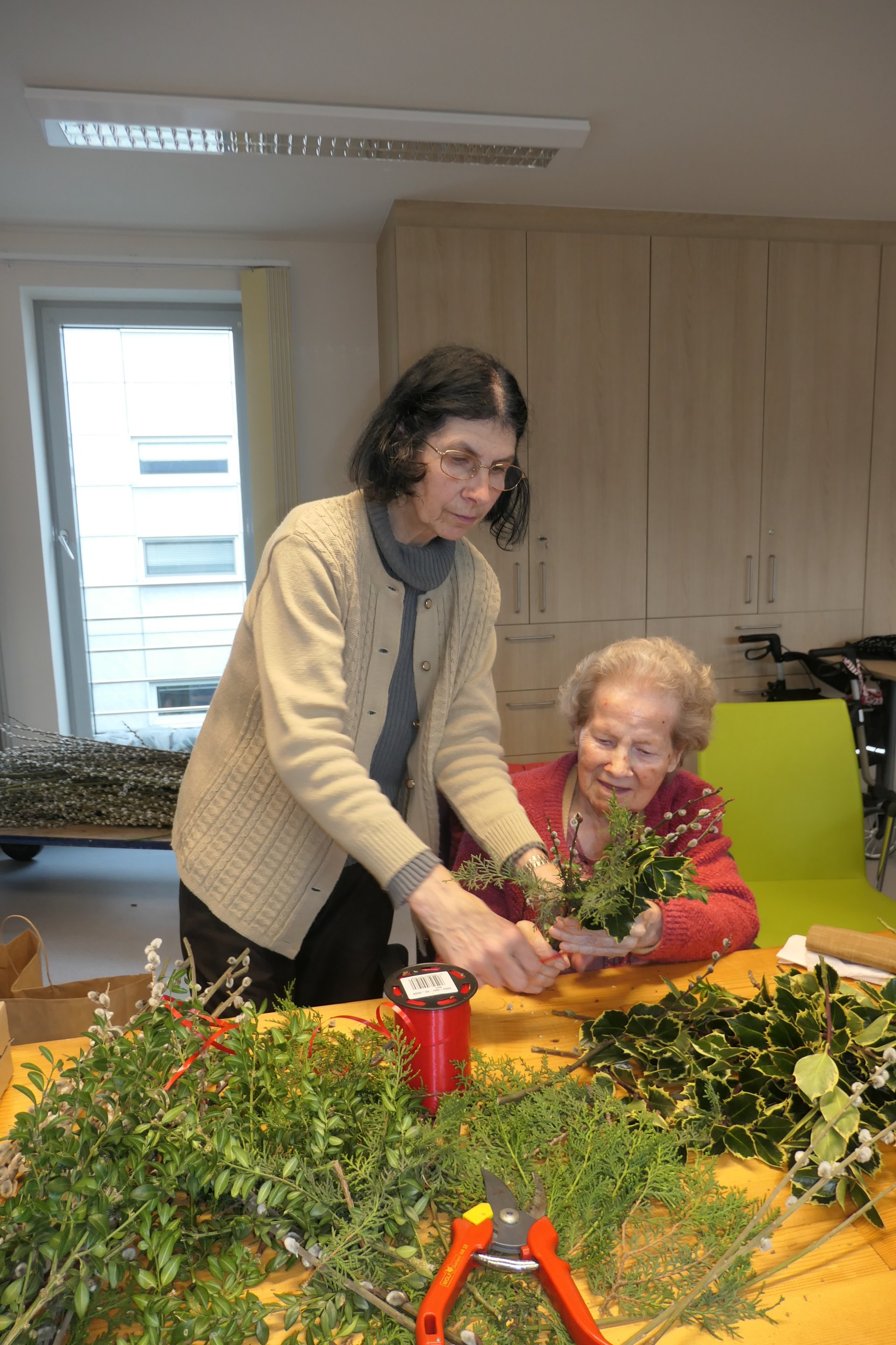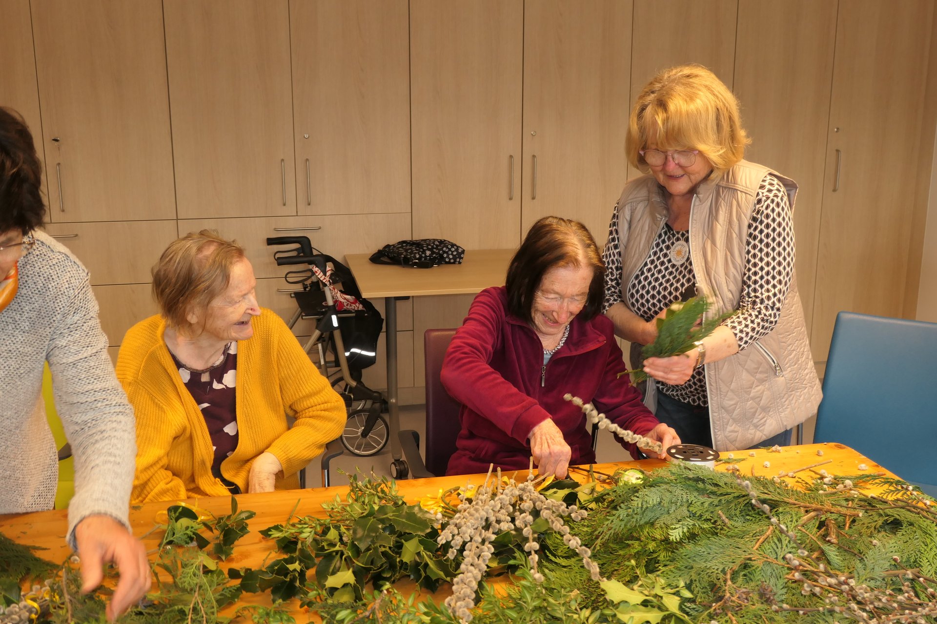 Palmbuschen wurden mit viel Geschick aus Palmkätzchen und Buchsbaum gebunden. Diese wurden dann feierlich geweiht. Ein Genuss für alle Sinne waren auch die gemeinsam gebackenen Osterstriezel. Die liebevoll gefertigten frühlingshaften Vasen wurden wunderschön und ein echter Blickfang in unseren Wohnbereichen.